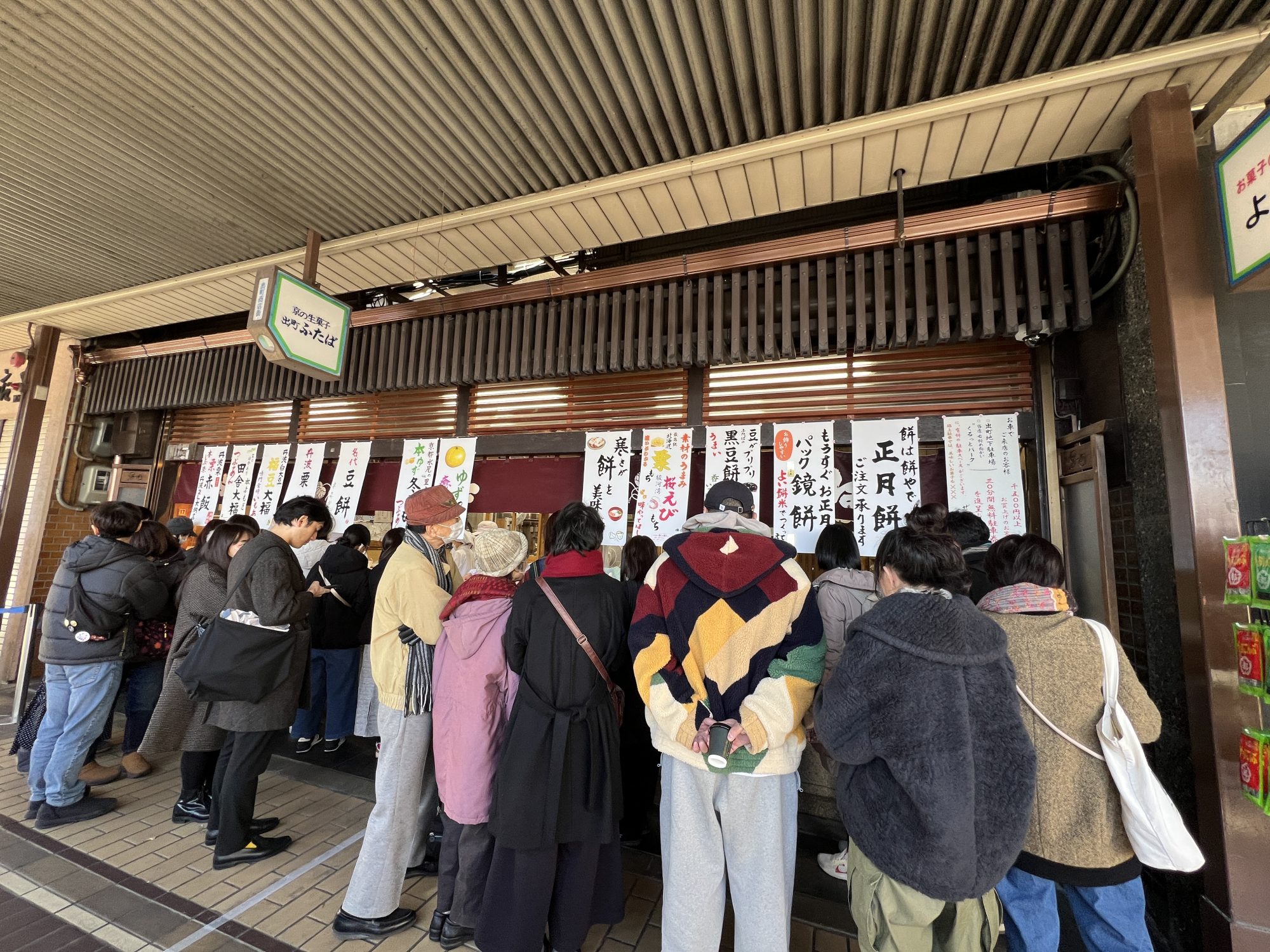 出町ふたば!信号渡って鴨川の方まで続く列!案外すすみは早いけども、電話予約、整列係の人に言えば特別なもの以外は予約ができる。そうすると並ばなくてよく。