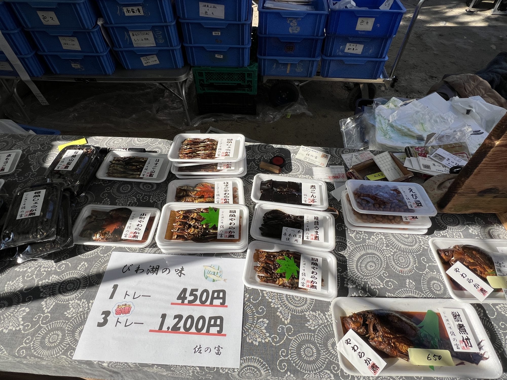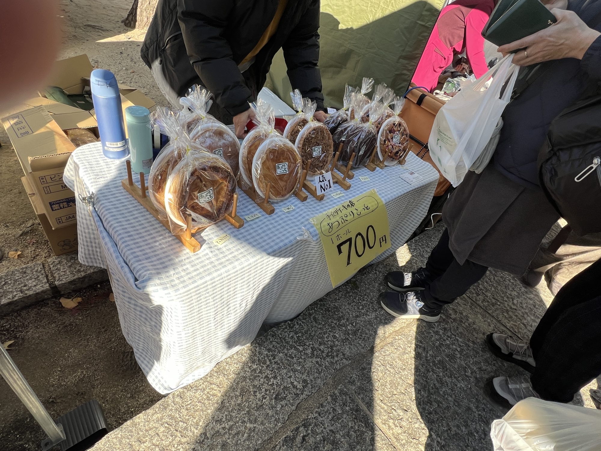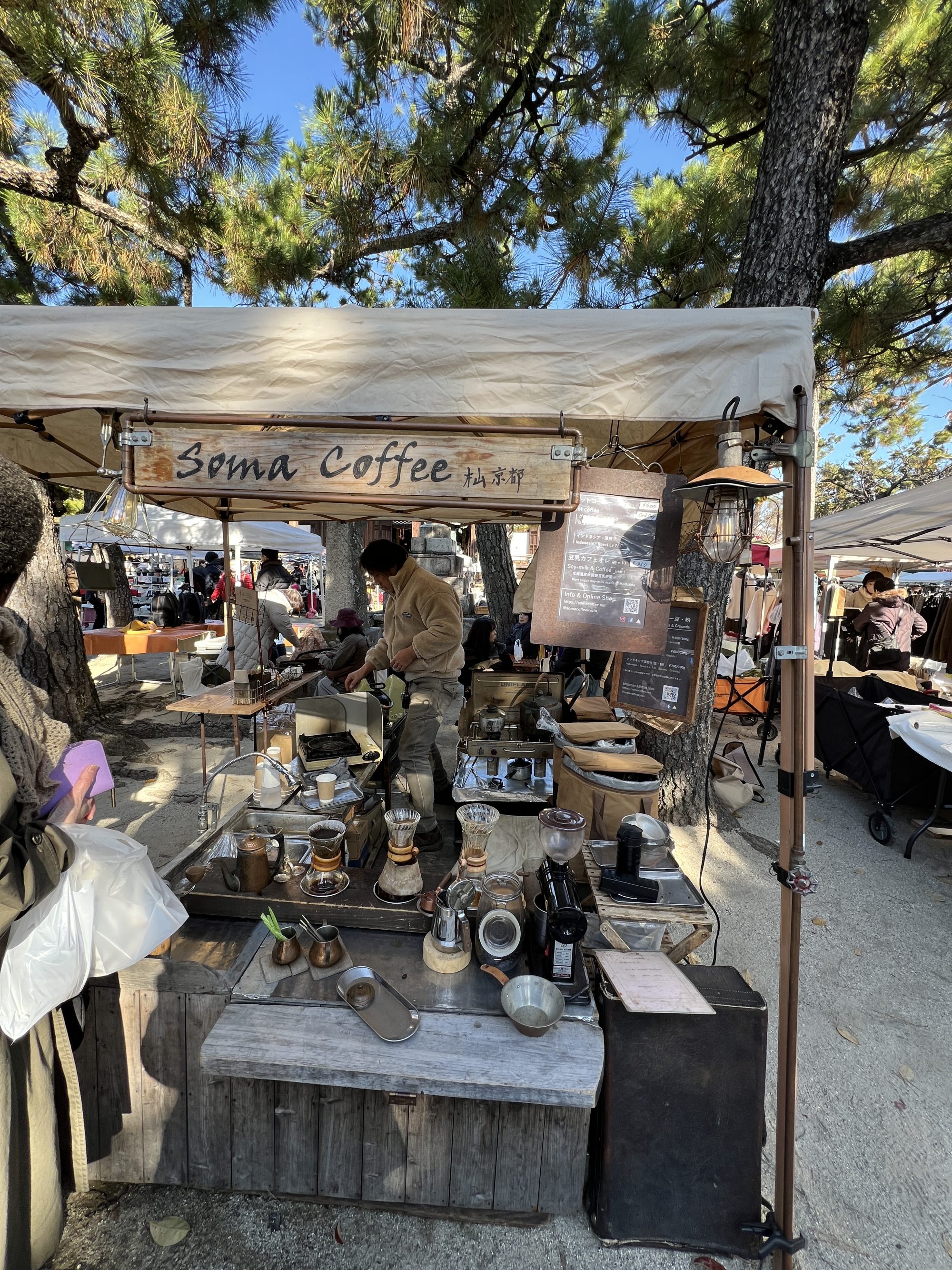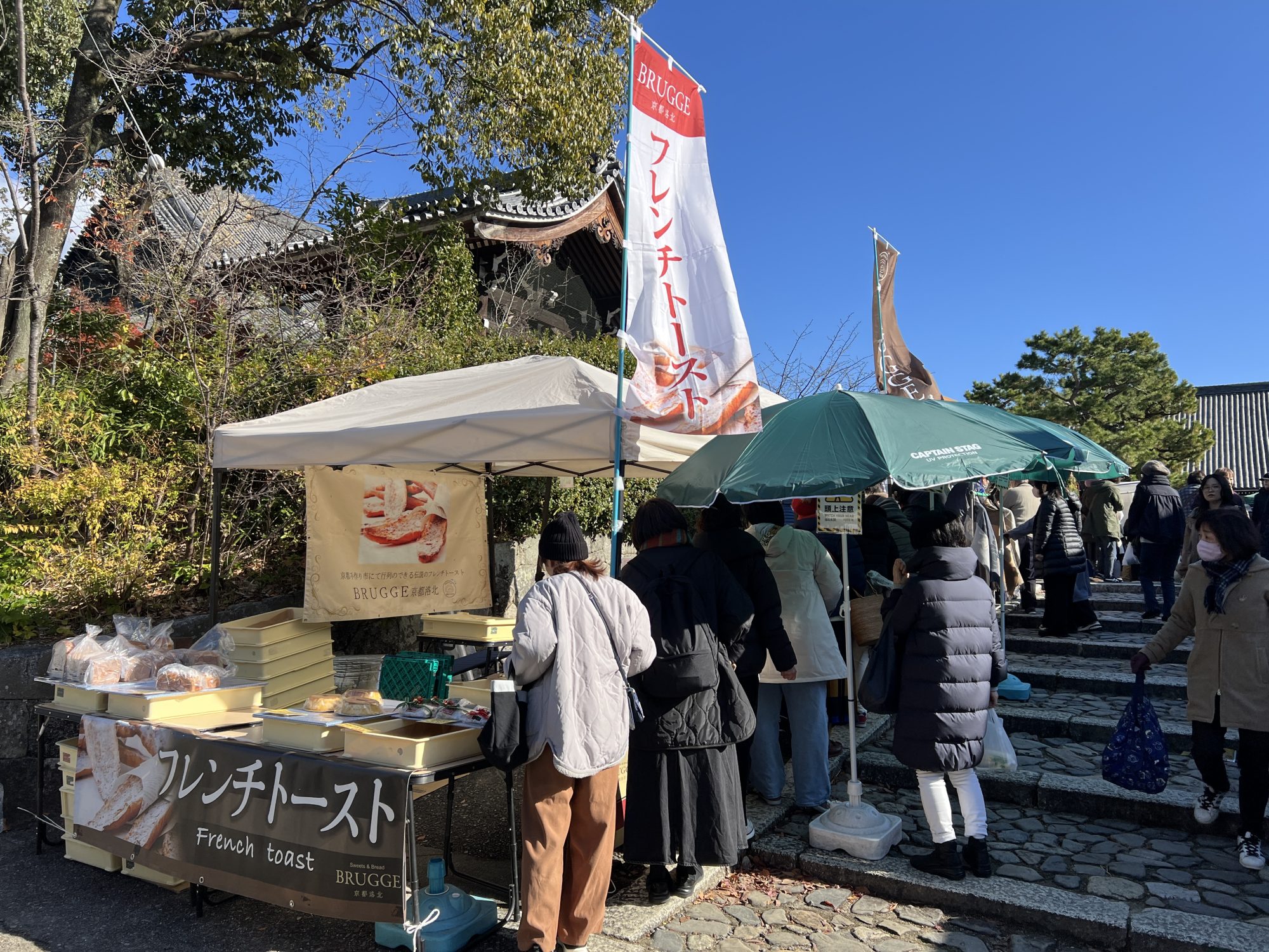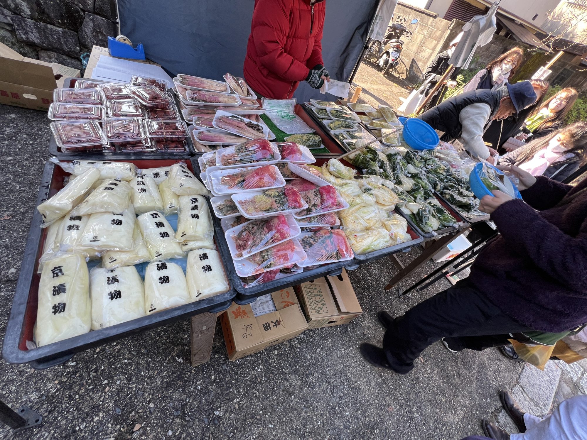 コーヒーのお店もいくつかあり、ちりめん山椒もいくつか。洛北ブルージュの前の3個500円の漬物屋さんは正午には売り切れる人気店。