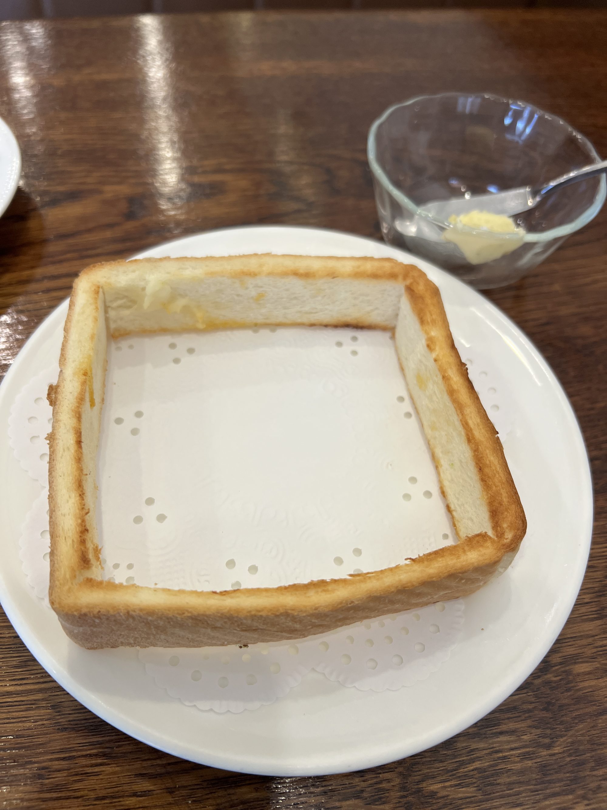このパンはオリエンタルベーカリーのパンで、くりぬいた耳は焼いてなく、見渡すとみんな残してて、残すなんて、って思ってたけど、パクりと齧ったら焼いてない耳はモソモソとして、とても食べにくく!焼いたバタートーストはあんなに美味しかったのに。