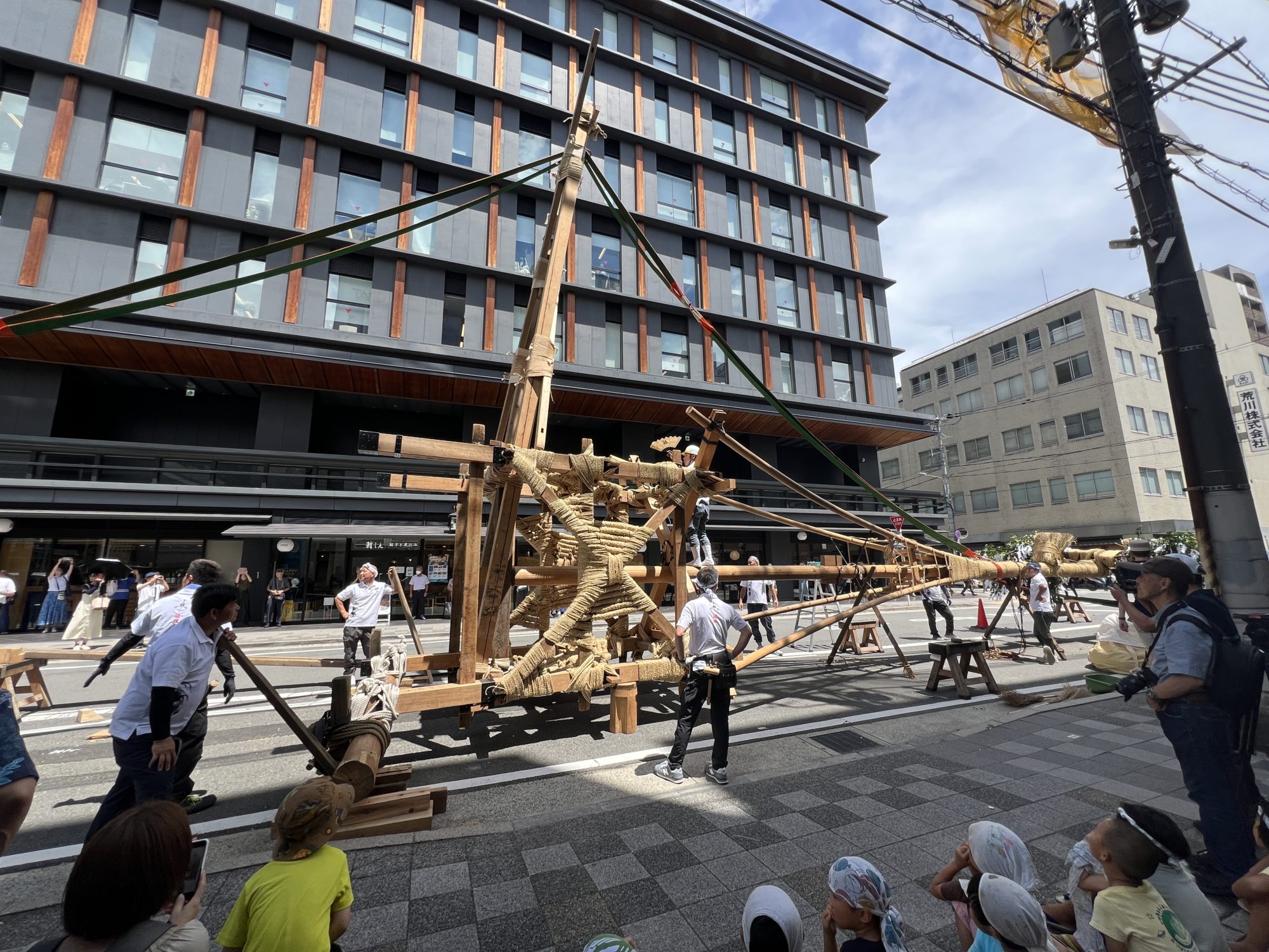 鶏鉾の組み立て。鶏鉾の榊に一般人も紙御幣(かみごへい)を結びつけることができる。ご利益があるとのこと。参加できるの楽しい・・・!