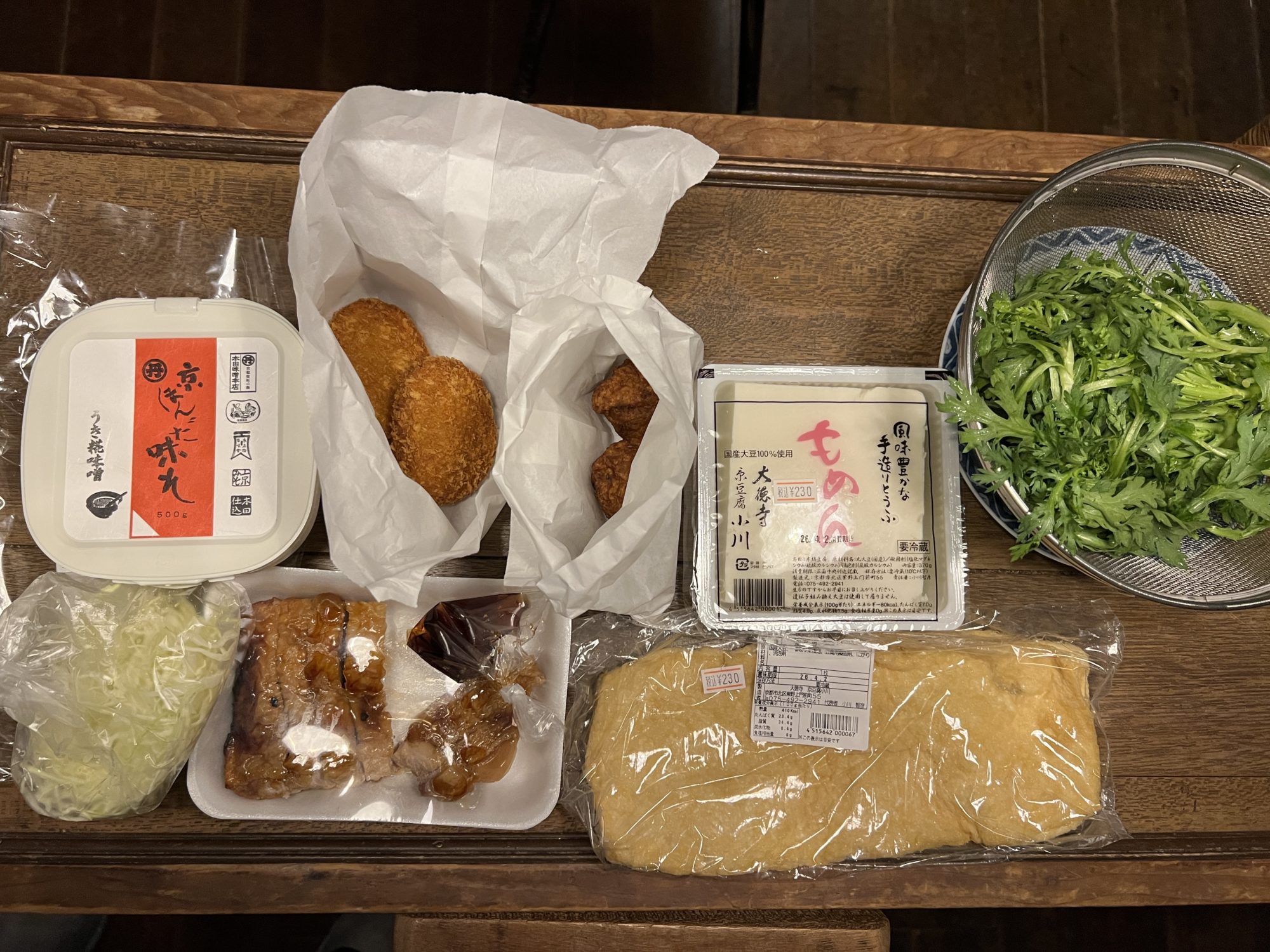 鳥末で豆腐と上賀茂の春菊と鳥のつまみあげ。